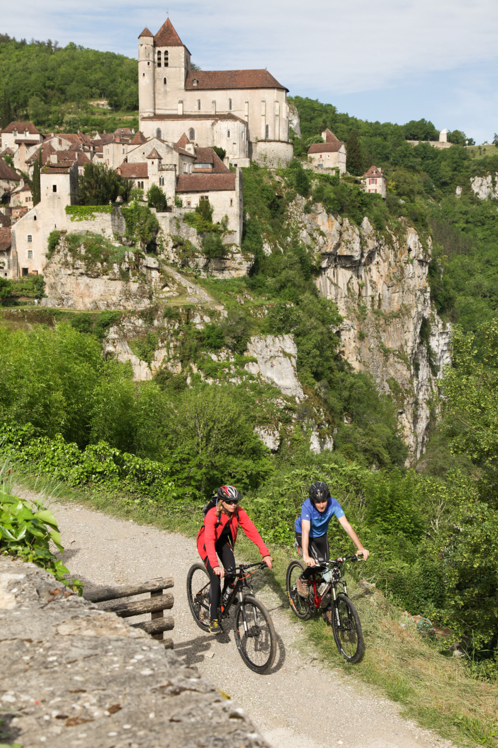 De afdaling vanaf Pech Blanc is vrij pittig, goed blijven remmen, totdat je op de asfaltweg bent richting Cénévières, een dorp aan de Lot met gelijknamig kasteel. Hier zit een fijn terras “Le Paradou”. Je steekt hierna de Lot over en maakt hoogte. Je verlaat het asfalt en volgt een gravelpad met uitizchten aan alle kanten. Bij Sauliac-sur-Célé is het weer rustig doortrappen over asfalt langs de rivier de Célé. Bij Monteils ga je weer de brug over en klim je helemaal omhoog tot in St-Chels. Ook hier kun je alle kanten ver uitkijken. Je kunt nu stoppen met trappen, want je gaat omlaag naar Larnagol. Steek de Lot over en klim via ons dorp Calvignac terug naar Pech Blanc. In Calvignac is in de zomermaanden een terras geopend “Bistro Belles Vues”.